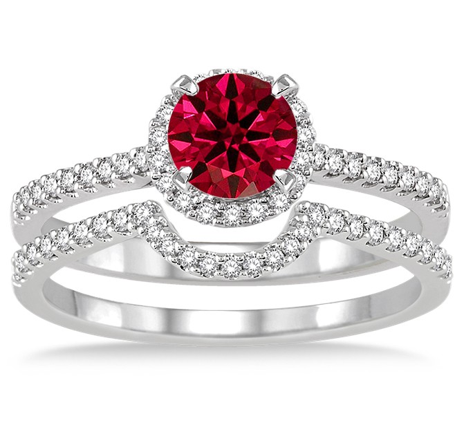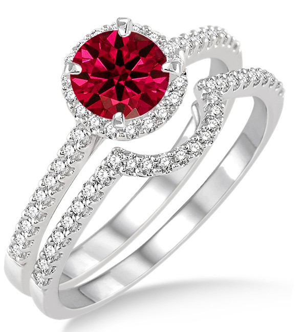 2 Carat Ruby & Diamond Halo Bridal Set Engagement Ring  on 10k White Gold. The sparkle of Ruby Gemstone along with glittering diamonds in this beautiful Ruby and diamond engagement ring wedding set would make her fall in love. The inexpensive Ruby and diamond gemstone bridal ring would be an instant family haireloom.