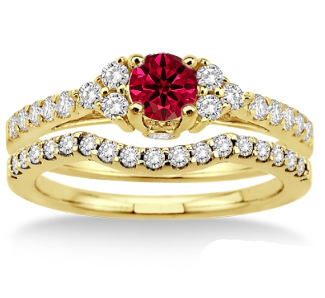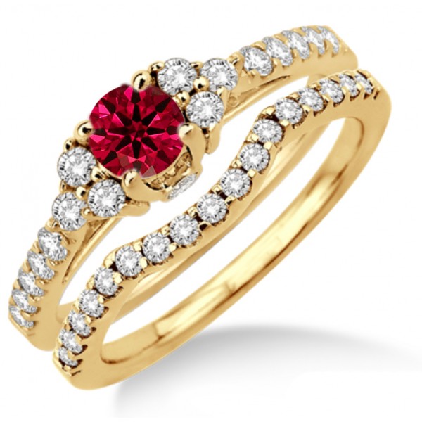 1.5 Carat Ruby & Diamond Bridal set  on 10k Yellow Gold.  If you are looking for a Ruby gemstone engagement ring set at affordable prices then look no further than this beautiful Ruby and diamond wedding engagement ring. This ring can be customized to 10k 14k or 18k gold.